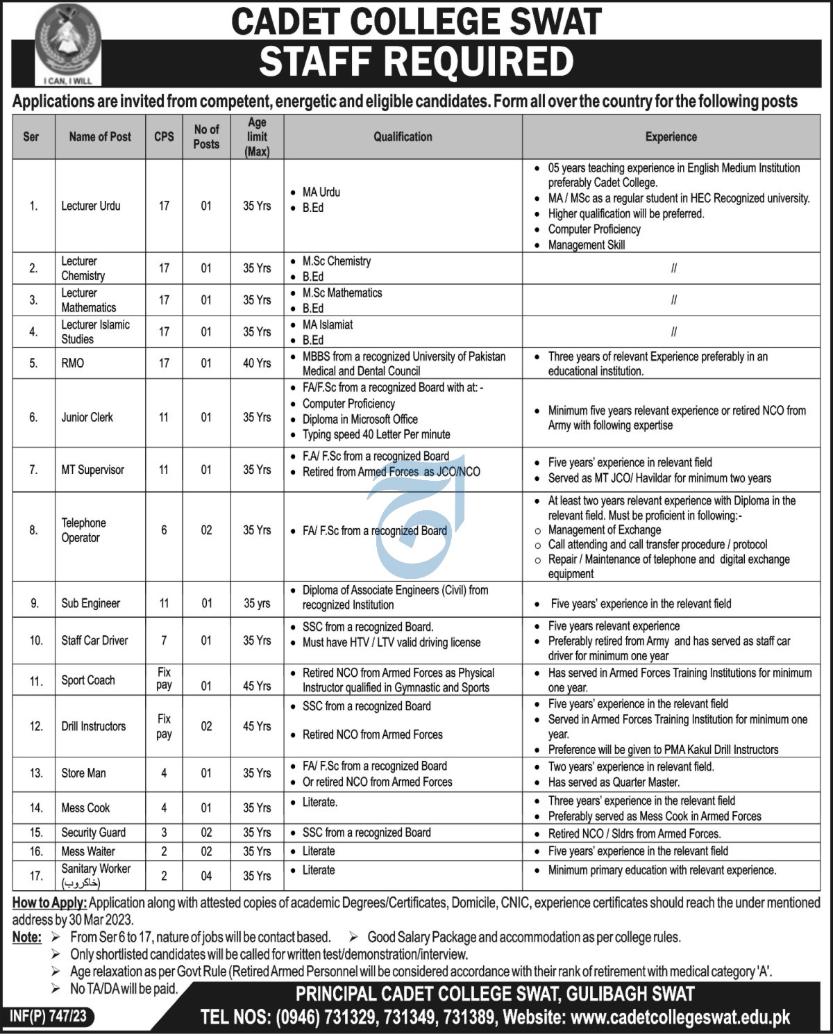 Cadet College jobs advertisement dated about 14 March 2023 in daily Aaj Newspaper invites application for the vacant post of lecturer islamic studies, mt supervisor, sub engineer, drill instructor, lecturer, lecturer mathematics, security guard, sport coach, clerk, mess cook, store man, rmo, resident medical officer rmo, lecturer urdu, mess waiter, sanitary worker, lecturer chemistry, telephone operator and staff car driver in Swat, swat Khyber Pakhtunkhwa KPK Pakistan. Persons with DAE, Intermediate, MA, M.sc, MBBS, Primary, B.ed and Matric etc. education can apply.