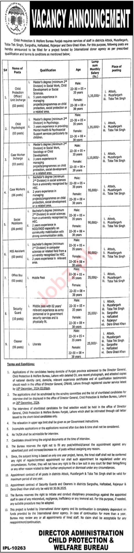 Vacant posts including social mobilizer, office boy, mis assistant, unit incharge, case worker, child protection officer, security guard, child psychologist, cleaner and case worker incharge are announced in Child Protection & Welfare Bureau Attock, muzaffargarh, sargodha, rajanpur, attock, hafizabad, dera ghazi khan and toba tek singh Punjab Pakistan as per 25 November 2024 advertisement in daily Jang Newspaper. Preferred Education is Middle, Bachelor, Primary and Master etc.