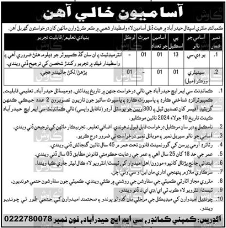 Combined Military Hospital CMH Hyderabad, hyderabad Sindh Pakistan invites applications from eligible candidates for the post of udc and sanitary worker as per advertisement of July 2, 2024 published in daily Kawish Newspaper. Educational qualifications required Intermediate and Primary etc.