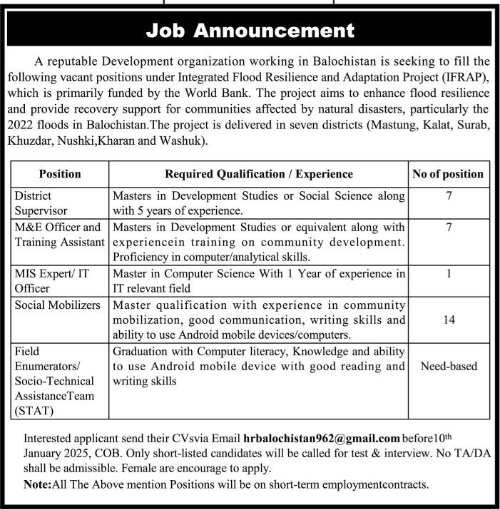 Vacant posts including social mobilizer, mis expert, it officer, field enumerator, district supervisor, socio technical assistance team, me officer and training assistant are announced in Development Organization Mastung, mastung, nushki, khuzdar, kharan, kalat and washuk Balochistan Pakistan as per 3 January 2025 advertisement in daily Other Newspaper. Preferred Education is Master and Bachelor etc.