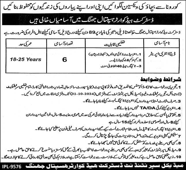 Latest District Headquarter Hospital DHQ Data Entry Posts Jhang 2025
