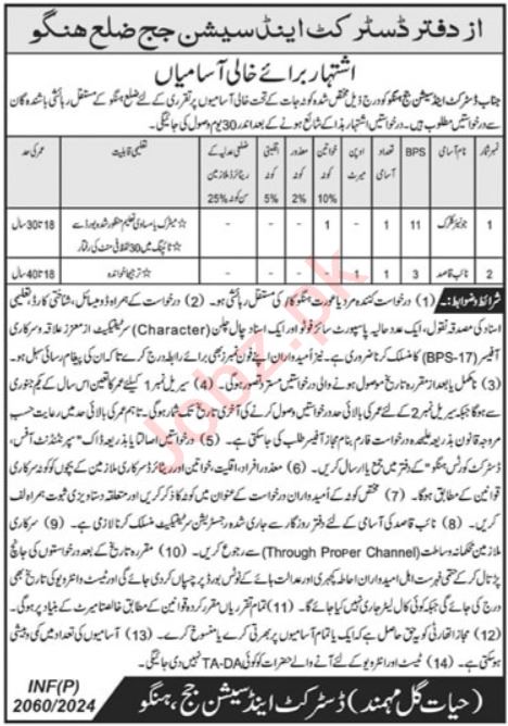 District & Session Judge invites applications for job positions advertised in daily Mashriq dated 19 August 2024 for following vacancies in Hangu, hangu Khyber Pakhtunkhwa KPK Pakistan.