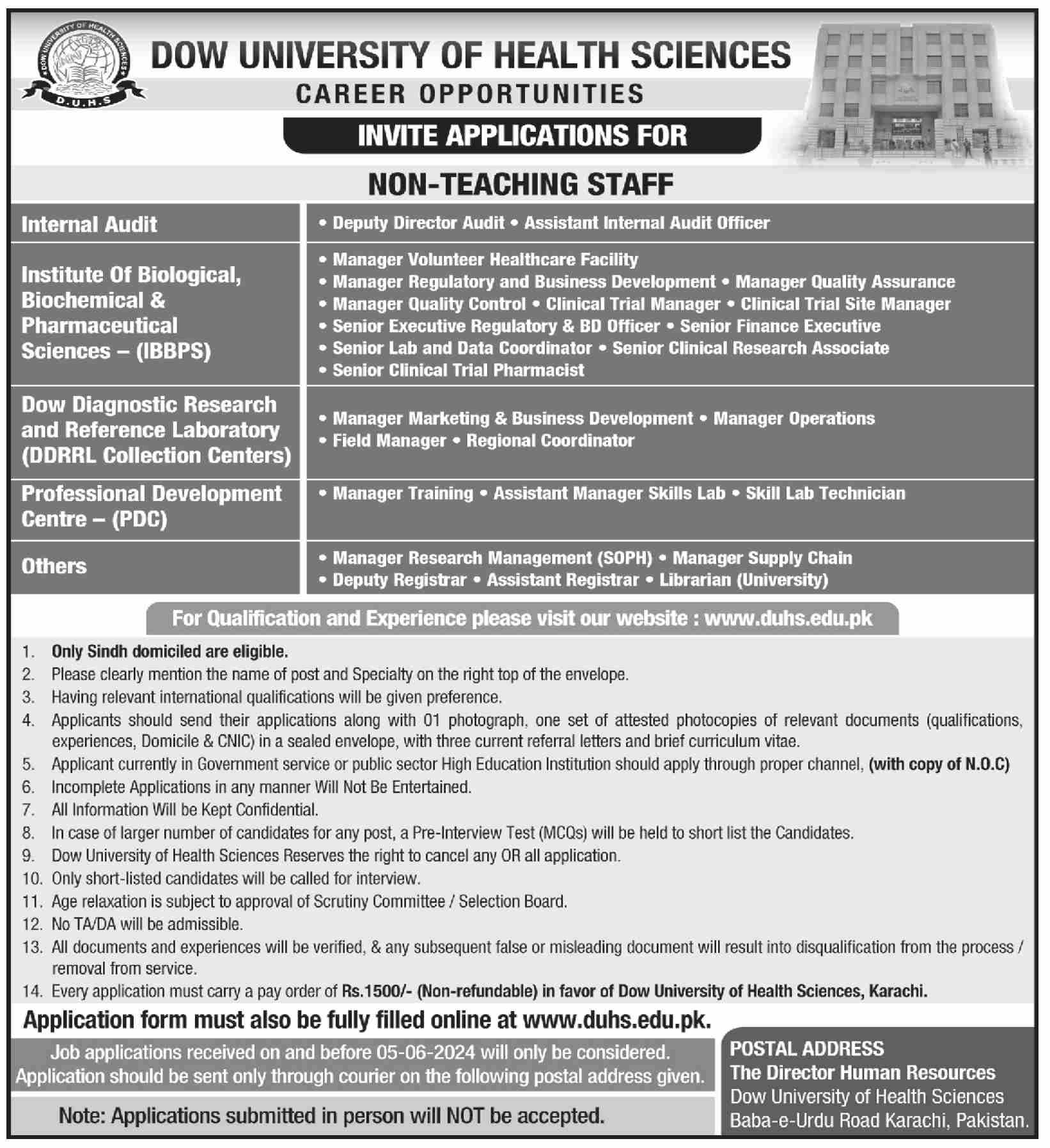 Vacancies in Dow University of Health Sciences Advertisement May 2024