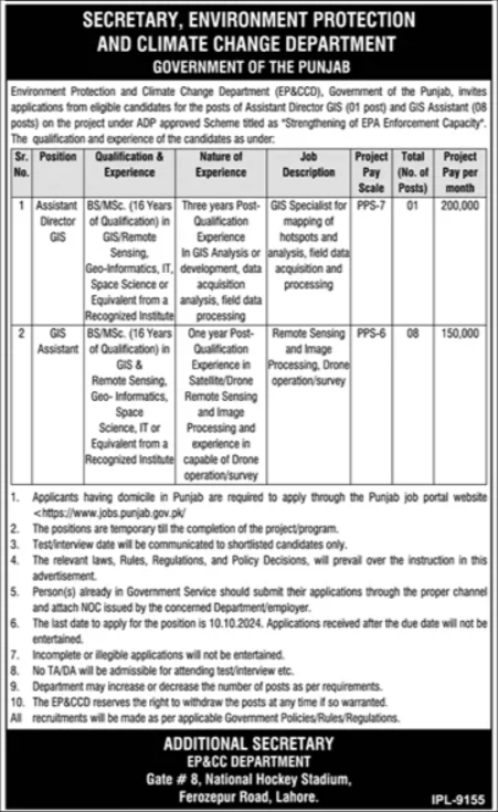 Vacant posts including assistant director gis and gis assistant are announced in Environment Protection & Climate Change Department Lahore, lahore Punjab Pakistan as per 24 September 2024 advertisement in daily Dunya Newspaper. Persons with M.sc etc. education can apply.