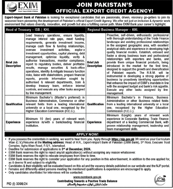 Vacancies in Exim Import Bank of Pakistan Advertisement November 2024