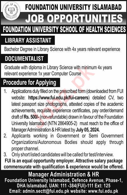 Vacancies in Foundation University Islamabad Advertisement June 2024
