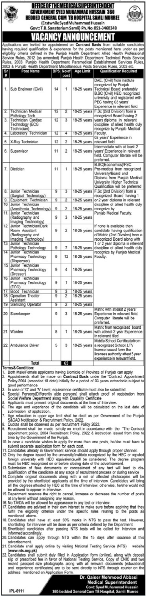 Vacancies in Syed Huhammaad Hussain Government TB Sanatorium Samli Advertisement June 2024
