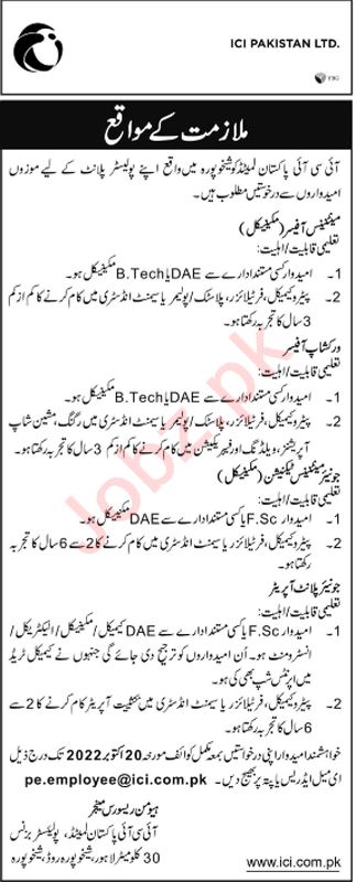 ICI Pakistan Limited Sheikhupura, sheikhupura Punjab Pakistan invites applications from eligible candidates for the post of plant operator, maintenance officer mechanical, maintenance technician mechanical and workshop officer as per advertisement of October 9, 2022 published in daily Nawaiwaqt Newspaper. Candidates with DAE, Intermediate and B.E etc. educational background will be preferred.