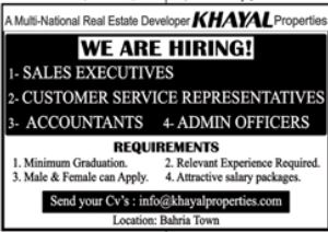 Khayal Properties jobs advertisement dated about 25 March 2022 in daily Jang Newspaper invites application for the vacant post of admin officer, sales executives, customer service representative and accountant in Rawalpindi, rawalpindi Punjab Pakistan. Persons with Bachelor etc. education can apply.