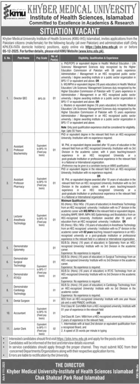 Khyber Medical University KMU is looking for candidates for following posts as per job advertisement published in daily Jang Newspaper of November 15, 2025 for location Chak Shahzad Islamabad, islamabad Islamabad Pakistan: