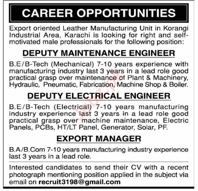 Vacant posts including deputy electrical engineer, deputy maintenance engineer and export manager are announced in Manufacturing Unit Karachi, karachi Sindh Pakistan as per 18 August 2024 advertisement in daily Dawn Newspaper. Persons with B.E, Bachelor, BA and B.com etc. education can apply.
