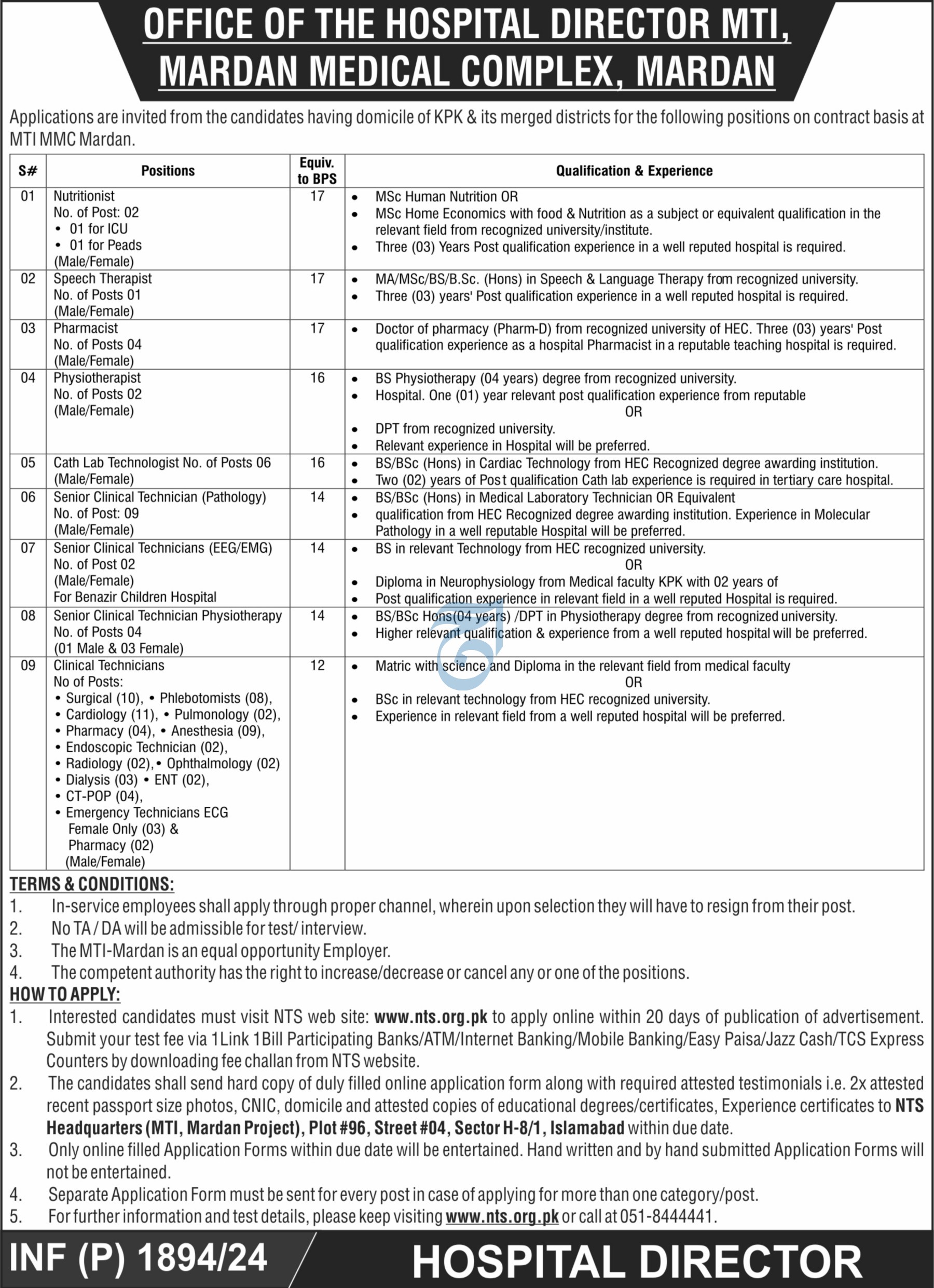 Vacant posts including clinical technician ophthalmology, speech therapist, clinical technician surgical, clinical technician phlebotomist, clinical technician pharmacy, pharmacist, clinical technician pathology, clinical technician emg, physiotherapist, clinical technician ent, clinical technician dialysis, clinical technician pulmonology, clinical technician endoscopic, clinical technician anesthesia, clinical technician radiology, clinical technician eeg, emergency technician, clinical technician physiotherapy, cath lab technologist, nutritionist and clinical technician cardiology are announced in Medical Teaching Institution MTI Mardan, mardan Khyber Pakhtunkhwa KPK Pakistan as per 2 August 2024 advertisement in daily Aaj Newspaper. MA, Others, M.sc, Matric and Pharma D etc. educational qualification will be preferred.