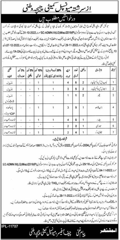 Municipal Committee jobs advertisement dated about 14 November 2022 in daily Nawaiwaqt Newspaper invites application for the vacant post of beldar, plumber, tubewell operator cum chowkidar, sanitary worker, naib qasid, sewer man and disposal operator cum chowkidar in Chichawatni, chichawatni Punjab Pakistan. Persons with Middle and Primary etc. education can apply.