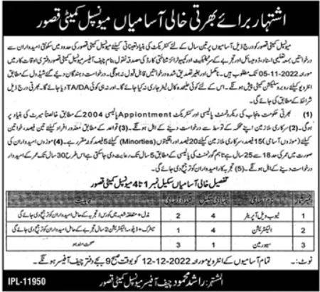 Municipal Committee invites applications for job positions advertised in daily Dunya dated 18 November 2022 for following vacancies in Kasur, kasur Punjab Pakistan.