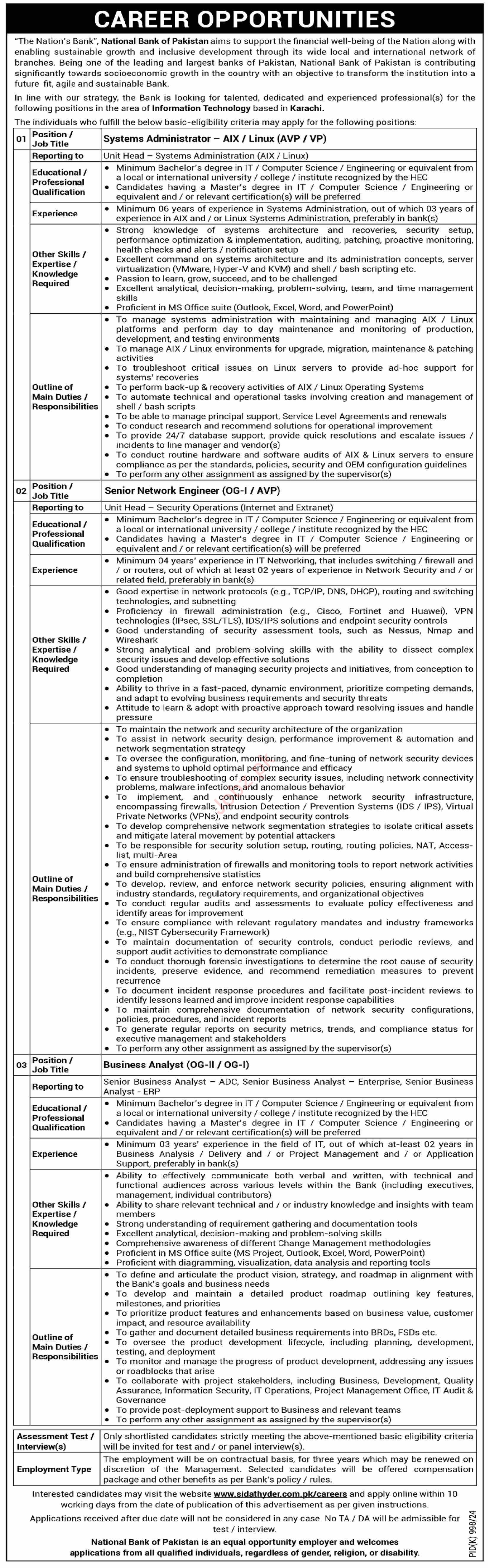 National Bank of Pakistan NBP invites applications for job positions advertised in daily Dawn dated 29 September 2024 for following vacancies in Karachi, karachi Sindh Pakistan.