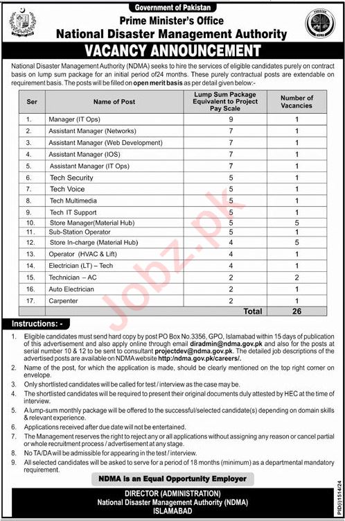 Vacant posts including Sub Station Operator, Auto Electrician, Electrician, Store Manager Material Hub, Carpenter, Assistant Manager Ios, Store Incharge, Assistant Manager Networks, Assistant Manager It Ops, Tech Voice, Assistant Manager Web Development, Tech It Support, Technician Ac, Tech Security, Tech Multimedia, Manager It Ops and Hvac Lift Operator are announced in National Disaster Management Authority Islamabad, islamabad Islamabad Pakistan as per 1 September 2024 advertisement in daily Jang Newspaper. Candidates with Bachelor, Master and Middle etc. educational background will be preferred.