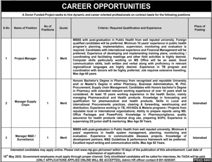 National TB Control Program NTP jobs advertisement dated about 4 May 2023 in daily Dunya Newspaper invites application for the vacant post of manager surveillance, manager me, manager supply chain and project manager in Islamabad, peshawar and islamabad Islamabad Pakistan. Candidates with Master, B Pharmacy, Mphil and MBBS etc. educational background will be preferred.