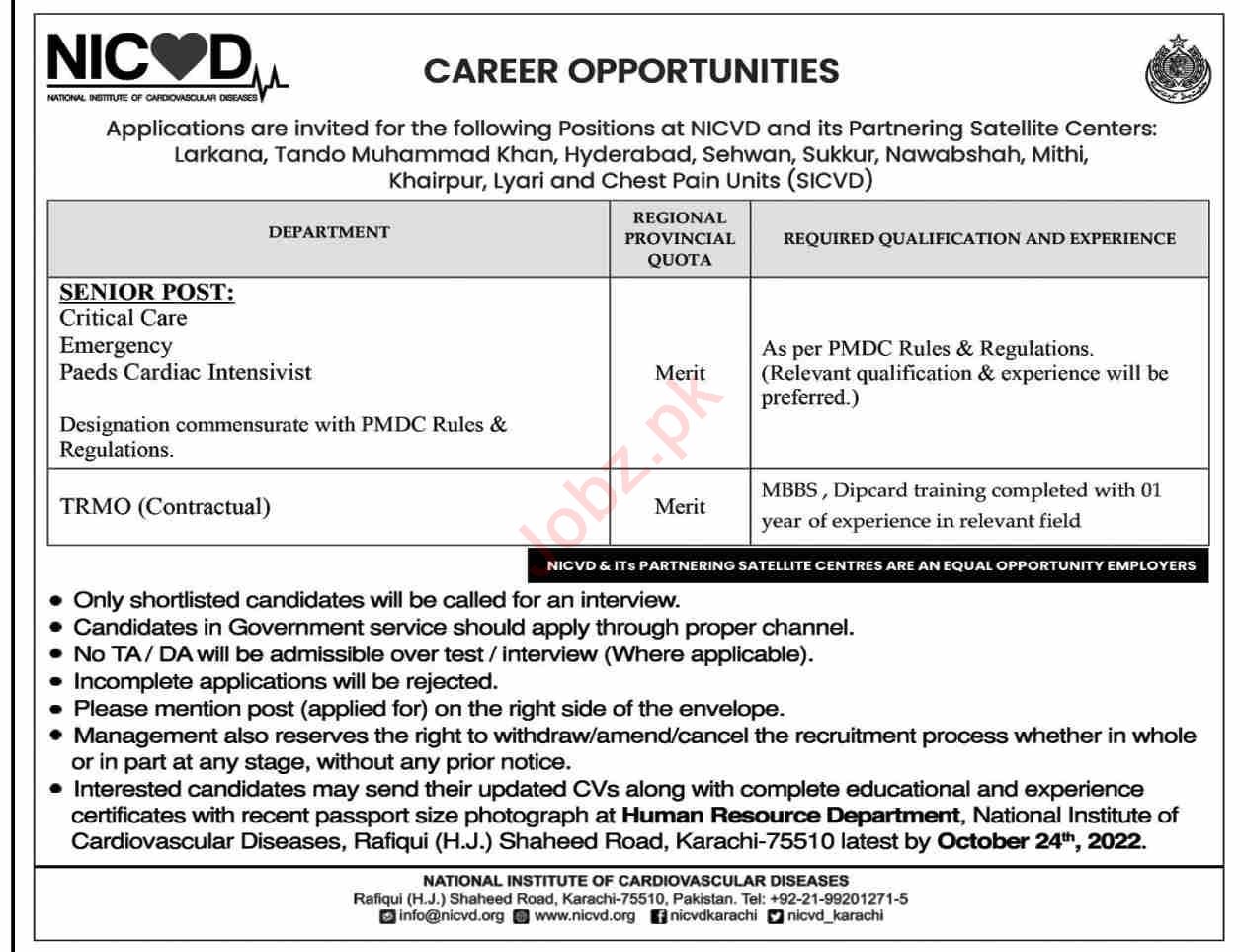 National Institute of Cardiovascular Diseases NICVD jobs advertisement dated about 10 October 2022 in daily Dawn Newspaper invites application for the vacant post of critical care intensivist, emergency intensivist, trmo, medical officer, paeds cardiac intensivist and doctor in Karachi, tando muhammad khan, khairpur, karachi, nawabshah, hyderabad, sukkur, larkana and mithi Sindh Pakistan. Preferred Education is Others and MBBS etc.