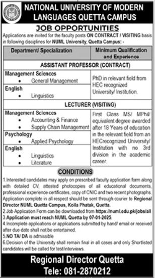 National University of Modern Languages NUML is looking for candidates for following posts as per job advertisement published in daily Jang Newspaper of December 31, 2024 for location Quetta, quetta Balochistan Pakistan: