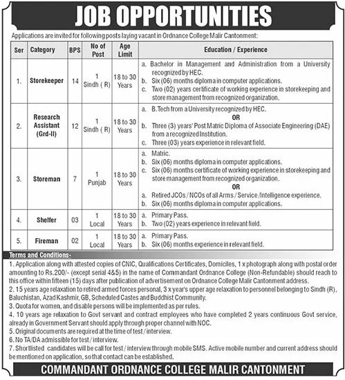 Ordnance College invites applications for job positions advertised in daily The News dated 7 December 2025 for following vacancies in Karachi, karachi Sindh Pakistan.