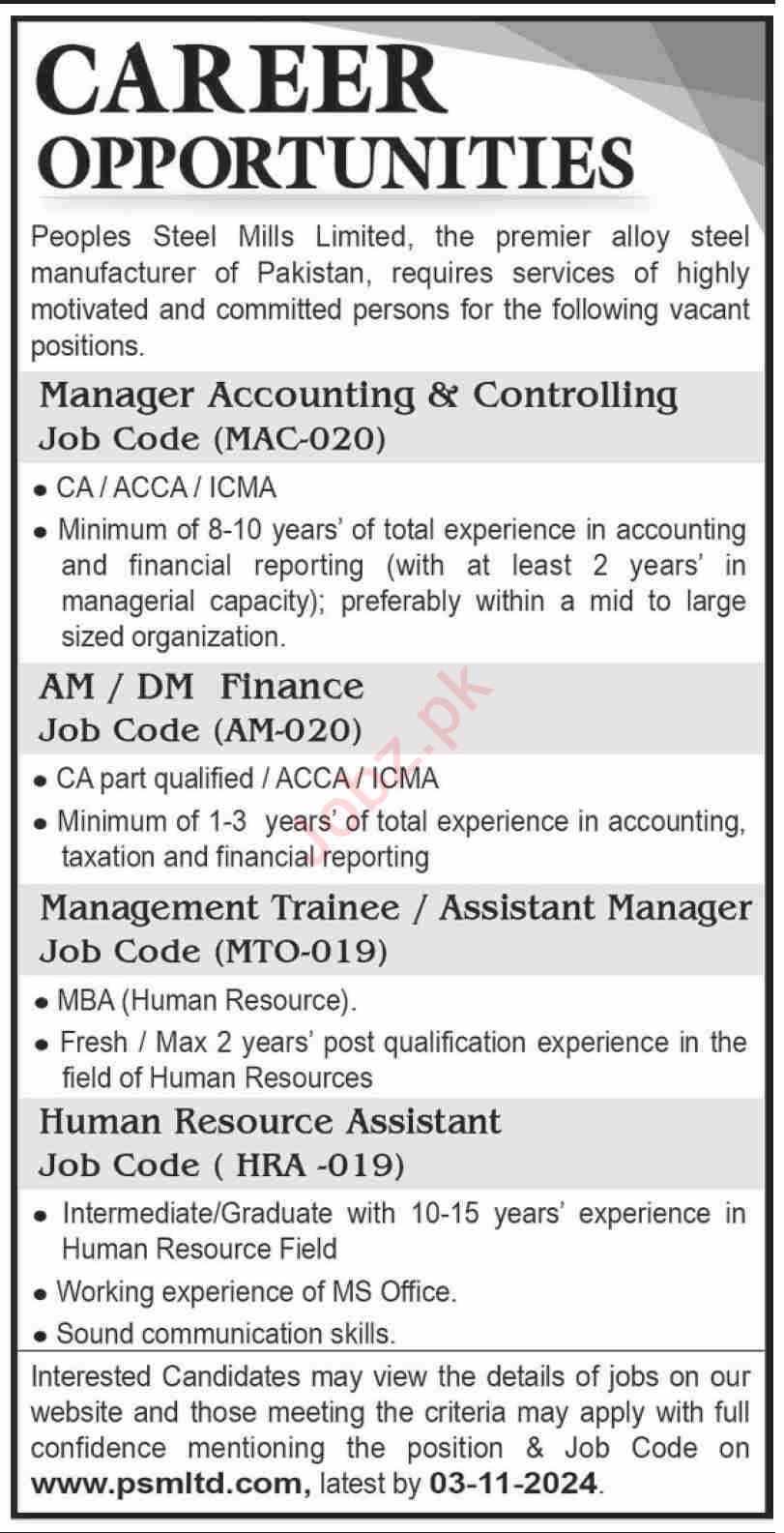 Vacant posts including assistant manager, dm finance, manager accounting controlling, management trainee, human resource assistant and am finance are announced in Peoples Steel Mills Limited PSML Karachi, karachi Sindh Pakistan as per 20 October 2024 advertisement in daily Dawn Newspaper. Persons with CA, Bachelor, Intermediate and ACCA etc. education can apply.