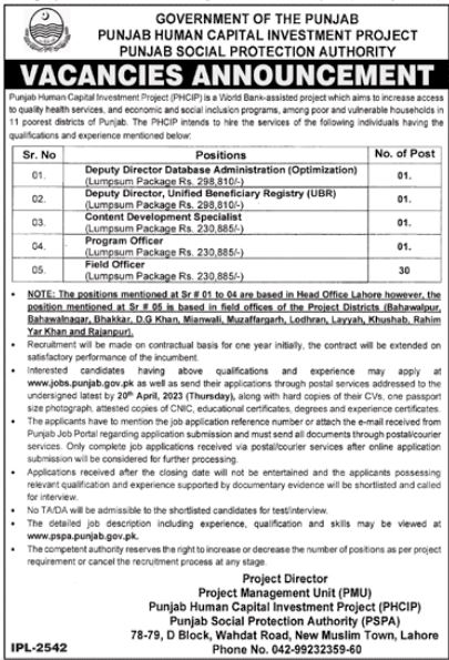 Vacancies in Punjab Human Capital Investment Project Advertisement April 2023