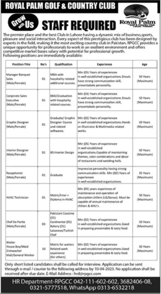 Royal Palm Golf & Country Club Lahore, lahore Punjab Pakistan invites applications from eligible candidates for the post of hvac technician, interior designer, general worker, chef de partie, manager banquet sales, receptionist, corporate sales executive, graphic designer, maid, waiter, mali, house boy and dish washer as per advertisement of March 27, 2023 published in daily Dunya Newspaper. Persons with MBA, BBA, Matric, Intermediate and Bachelor etc. education can apply.
