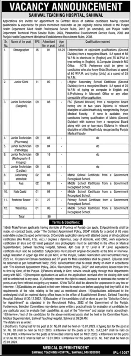 Sahiwal Teaching Hospital Sahiwal, sahiwal Punjab Pakistan invites applications from eligible candidates for the post of technician pathology, laboratory attendant, clerk, technician pharmacy, naib qasid, ward boy, technician surgical, stretcher bearer, aya, technician cardiac, technician radiography imaging and stenographer as per advertisement of December 16, 2022 published in daily Dunya Newspaper. Preferred Education is Primary, Middle, Intermediate, Others and Matric etc.