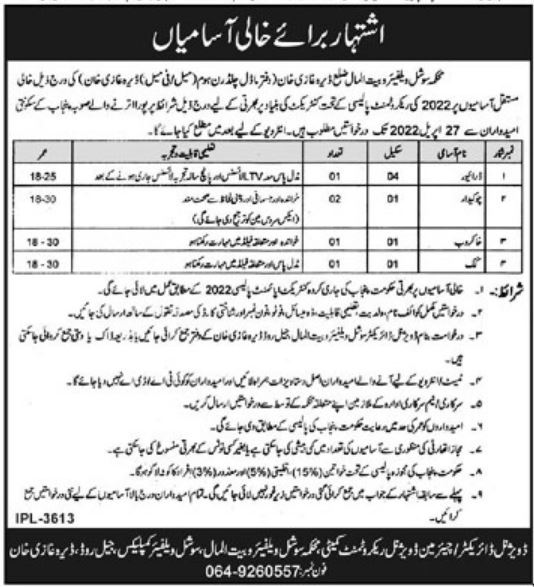 Social Welfare & Bait ul Maal Dera Ghazi Khan, dera ghazi khan Punjab Pakistan invites applications from eligible candidates for the post of khakrob, cook, chowkidar and driver as per advertisement of April 6, 2022 published in daily Khabrain Newspaper. Educational qualifications required Primary and Middle etc.
