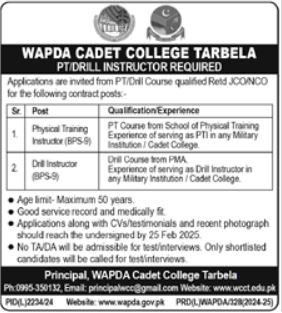 Wapda Cadet College Tarbela invites applications for job positions advertised in daily Khabrain dated 9 February 2025 for following vacancies in Tarbela, tarbela Khyber Pakhtunkhwa KPK Pakistan.