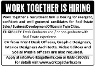 Vacant posts including interior designer architect, video editor, front desk officer, real estate sales officer, graphics designer, business development officer and social media officer are announced in Work Together Recruitment Firm Rawalpindi, islamabad and rawalpindi Punjab Pakistan as per 27 March 2022 advertisement in daily Jang Newspaper. Educational qualifications required Bachelor and Intermediate etc.