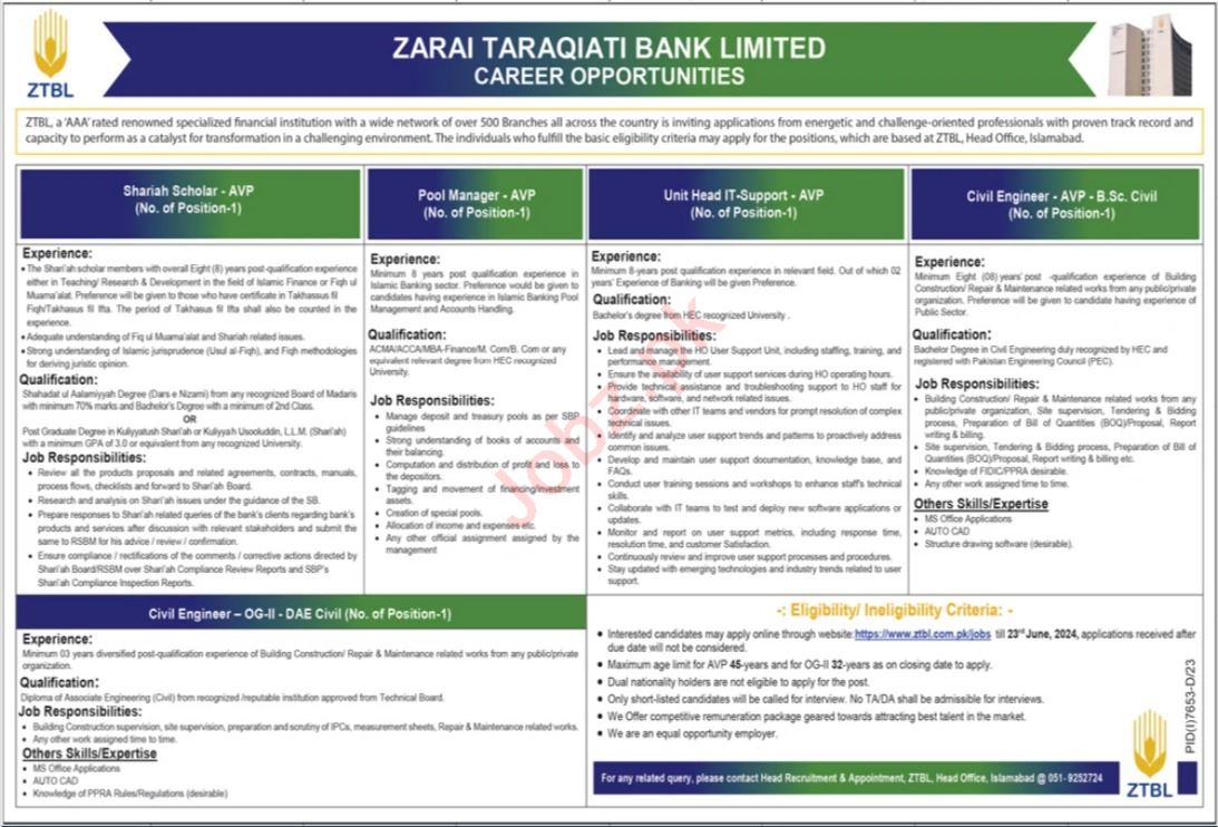 Zarai Taraqiati Bank Limited ZTBL Islamabad, islamabad Islamabad Pakistan invites applications from eligible candidates for the post of post manager avp, shariah scholar, unit head it support and civil engineer as per advertisement of June 10, 2024 published in daily Jang Newspaper. Educational qualifications required MBA, B.E, M.com, Bachelor, ACCA and CA etc.