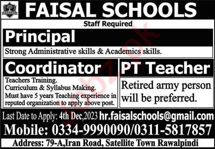 acant posts including principal, coordinator and pt teacher are announced in Faisal Schools Rawalpindi, rawalpindi Punjab Pakistan as per 26 November 2023 advertisement in daily Express Newspaper. Preferred Education is Intermediate, MS, MA, Bachelor and Master etc.