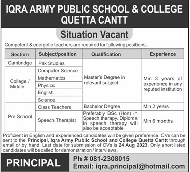 Iqra Army Public School & College invites applications for job positions advertised in daily Jang dated 20 August 2023 for following vacancies in Quetta, quetta Balochistan Pakistan.
