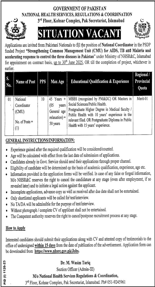 Ministry of National Health Services Regulations & Coordination NHSRC Islamabad, islamabad Islamabad Pakistan invites applications from eligible candidates for the post of national coordinator as per advertisement of August 20, 2023 published in daily Jang Newspaper. Persons with MBBS and Master etc. education can apply.