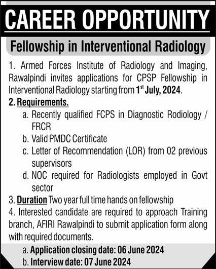 Armed Forces Institute of Radiology & Imaging AFIRI Rawalpindi, rawalpindi Punjab Pakistan invites applications from eligible candidates for the post of fellowship in interventional radiology as per advertisement of June 1, 2024 published in daily Express Newspaper. Preferred Education is MBBS and Others etc.