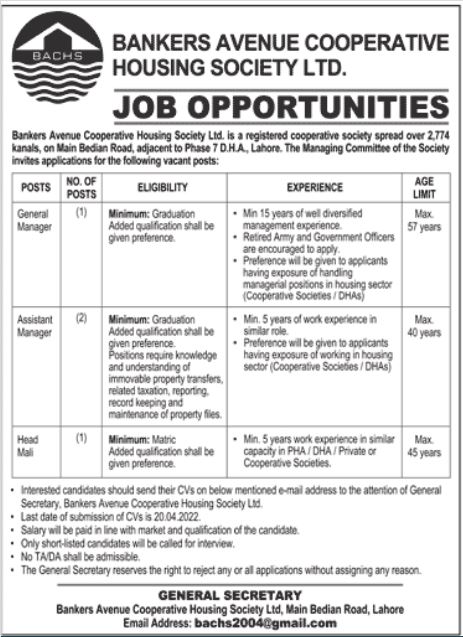 Bankers Avenue Cooperative Housing Society Ltd jobs advertisement dated about 10 April 2022 in daily Jang Newspaper invites application for the vacant post of assistant manager, general manager and head mali in Lahore, lahore Punjab Pakistan. Matric and Bachelor etc. educational qualification will be preferred.