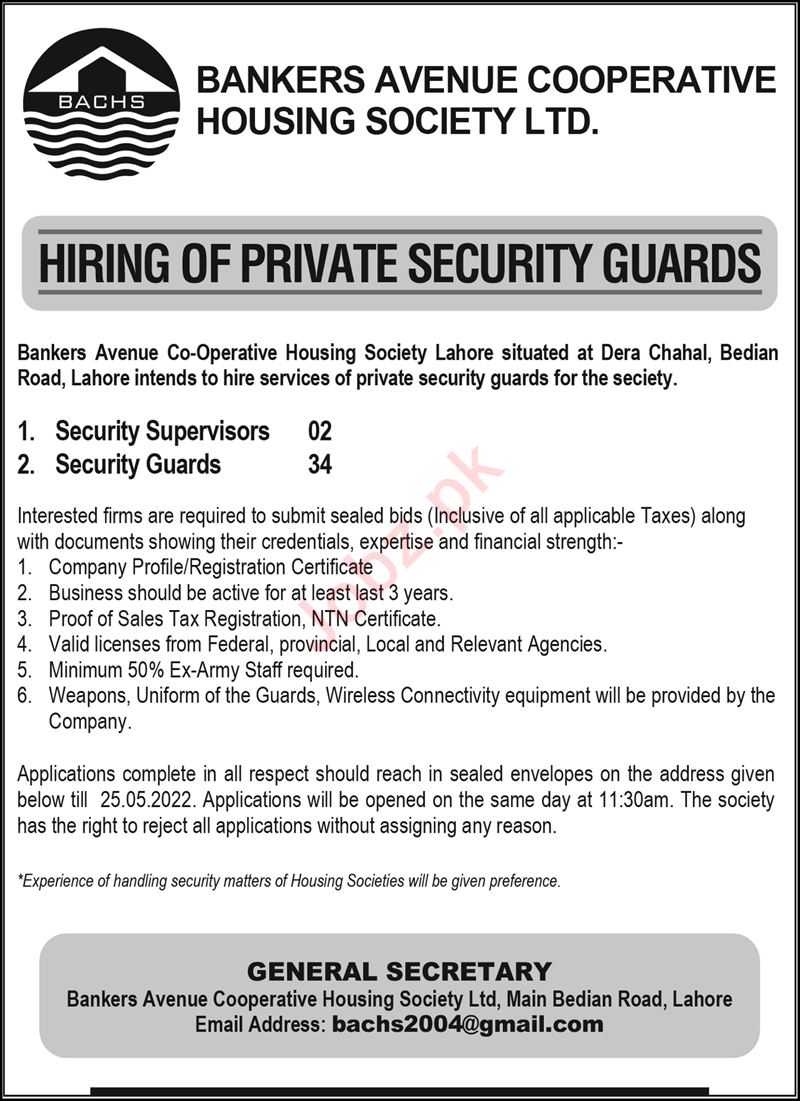 Latest Bankers Avenue Cooperative Housing Society Ltd Security Posts Lahore 2025