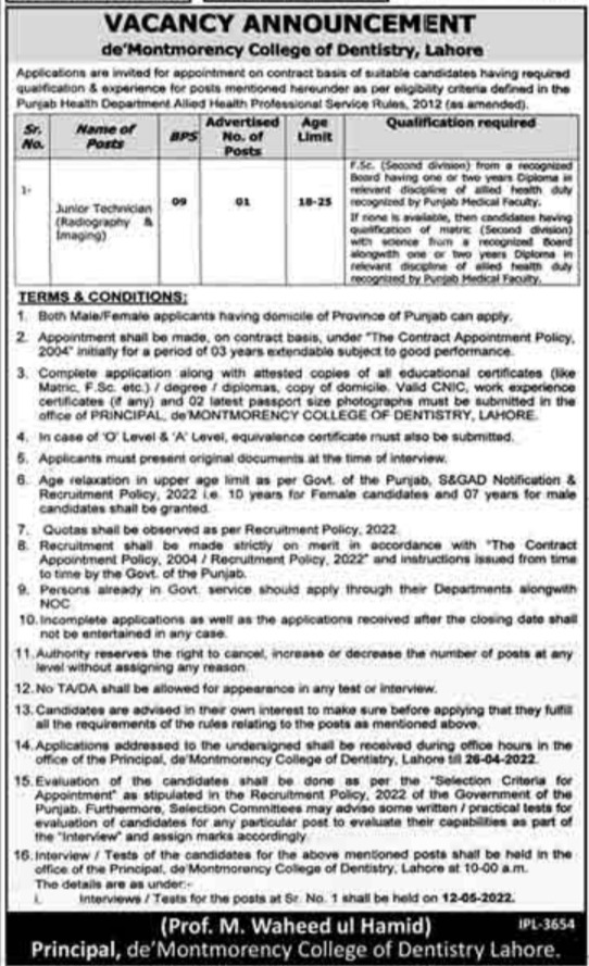 de Montmorency College of Dentistry Lahore, lahore Punjab Pakistan invites applications from eligible candidates for the post of technician radiography imaging as per advertisement of April 7, 2022 published in daily Dunya Newspaper. Candidates with Others, Matric and Intermediate etc. educational background will be preferred.