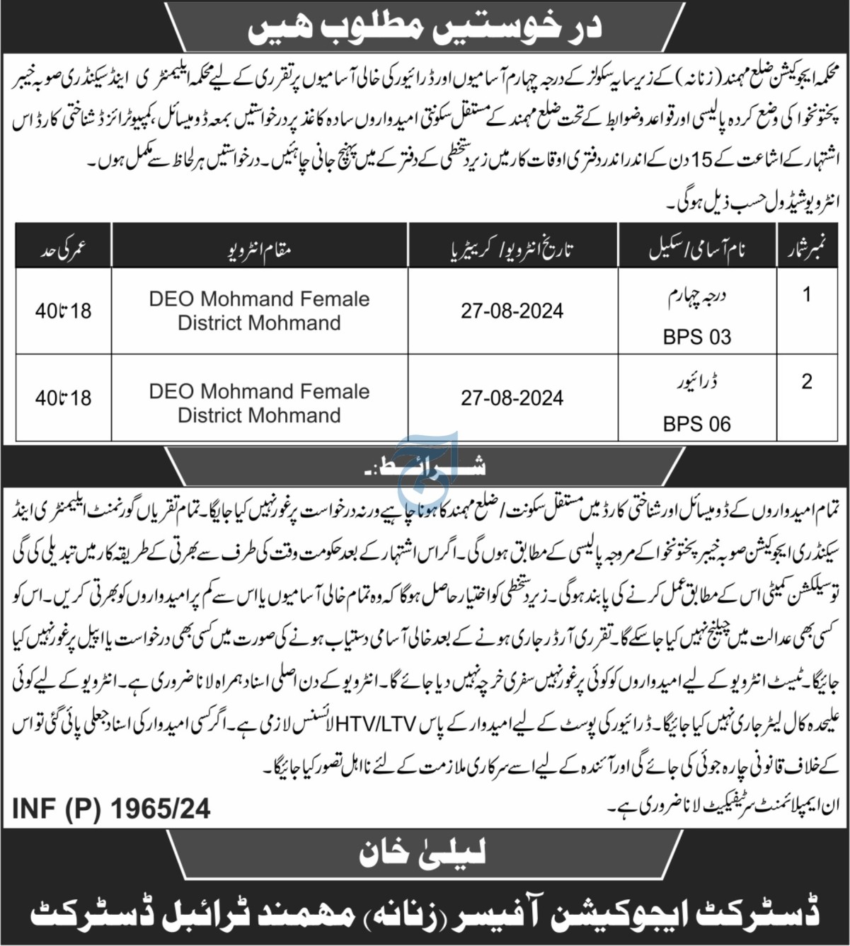 Education Department is looking for candidates for following posts as per job advertisement published in daily Aaj Newspaper of August 9, 2024 for location Mohmand, mohmand Khyber Pakhtunkhwa KPK Pakistan: