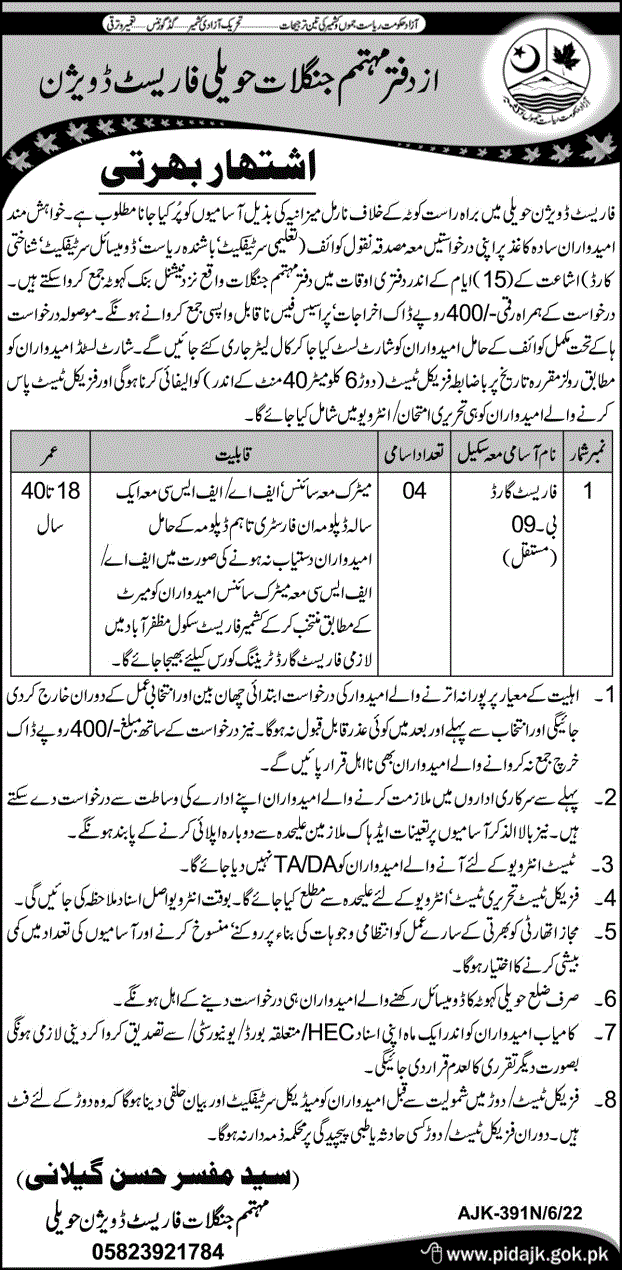 Forest Division is looking for candidates for following posts as per job advertisement published in daily Ausaf Newspaper of June 14, 2022 for location Haveli, haveli AJK Pakistan: