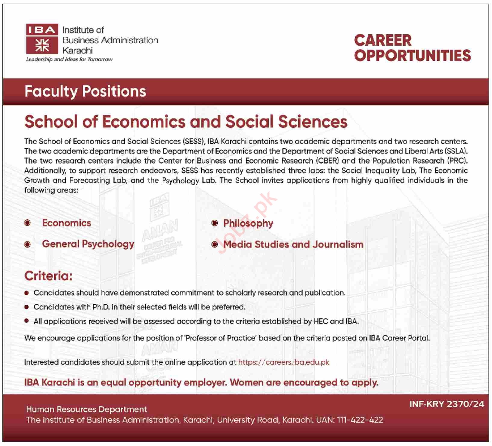 Institute of Business Administration IBA jobs advertisement dated about 28 July 2024 in daily Dawn Newspaper invites application for the vacant post of lecturer media studies journalism, lecturer philosophy, lecturer, lecturer general psychology and lecturer economics in Karachi, karachi Sindh Pakistan. Educational qualifications required Phd etc.