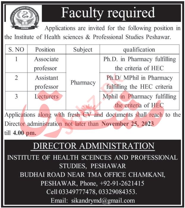 Institute of Health Sciences IHS is looking for candidates for following posts as per job advertisement published in daily Mashriq Newspaper of November 19, 2023 for location Peshawar, peshawar Khyber Pakhtunkhwa KPK Pakistan: