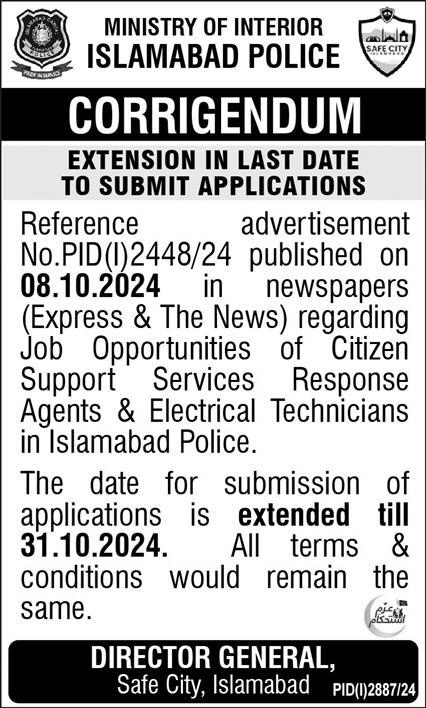 Vacant posts including electrical technician and citizen support services response agent are announced in Islamabad Capital Territory Police Islamabad, islamabad Islamabad Pakistan as per 27 October 2024 advertisement in daily Express Newspaper. Candidates with Intermediate and Bachelor etc. educational background will be preferred.