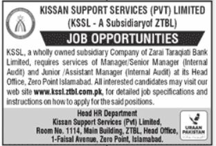 Kissan Support Services Pvt Limited KSSL jobs advertisement dated about 3 February 2025 in daily Jang Newspaper invites application for the vacant post of manager internal audit and assistant manager internal audit in Islamabad, islamabad Islamabad Pakistan. Candidates with Bachelor and Master etc. educational background will be preferred.