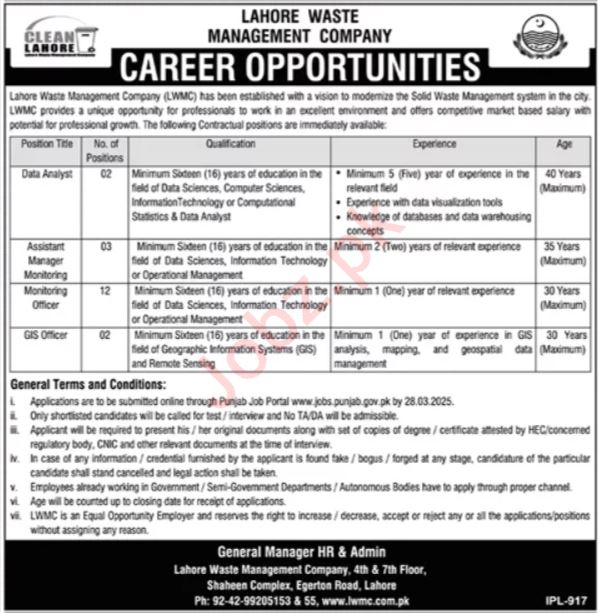 Lahore Waste Management Company Egerton Road Lahore, lahore Punjab Pakistan invites applications from eligible candidates for the post of data analyst, monitoring officer, gis officer and assistant manager monitoring as per advertisement of March 9, 2025 published in daily Dunya Newspaper. Bachelor and Master etc. educational qualification will be preferred.