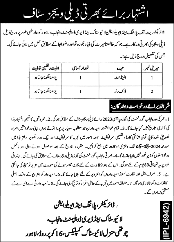 Livestock and Dairy Development Department Lahore, lahore Punjab Pakistan invites applications from eligible candidates for the post of daak runner and attendant as per advertisement of July 27, 2024 published in daily Nawaiwaqt Newspaper. Preferred Education is Primary and Middle etc.