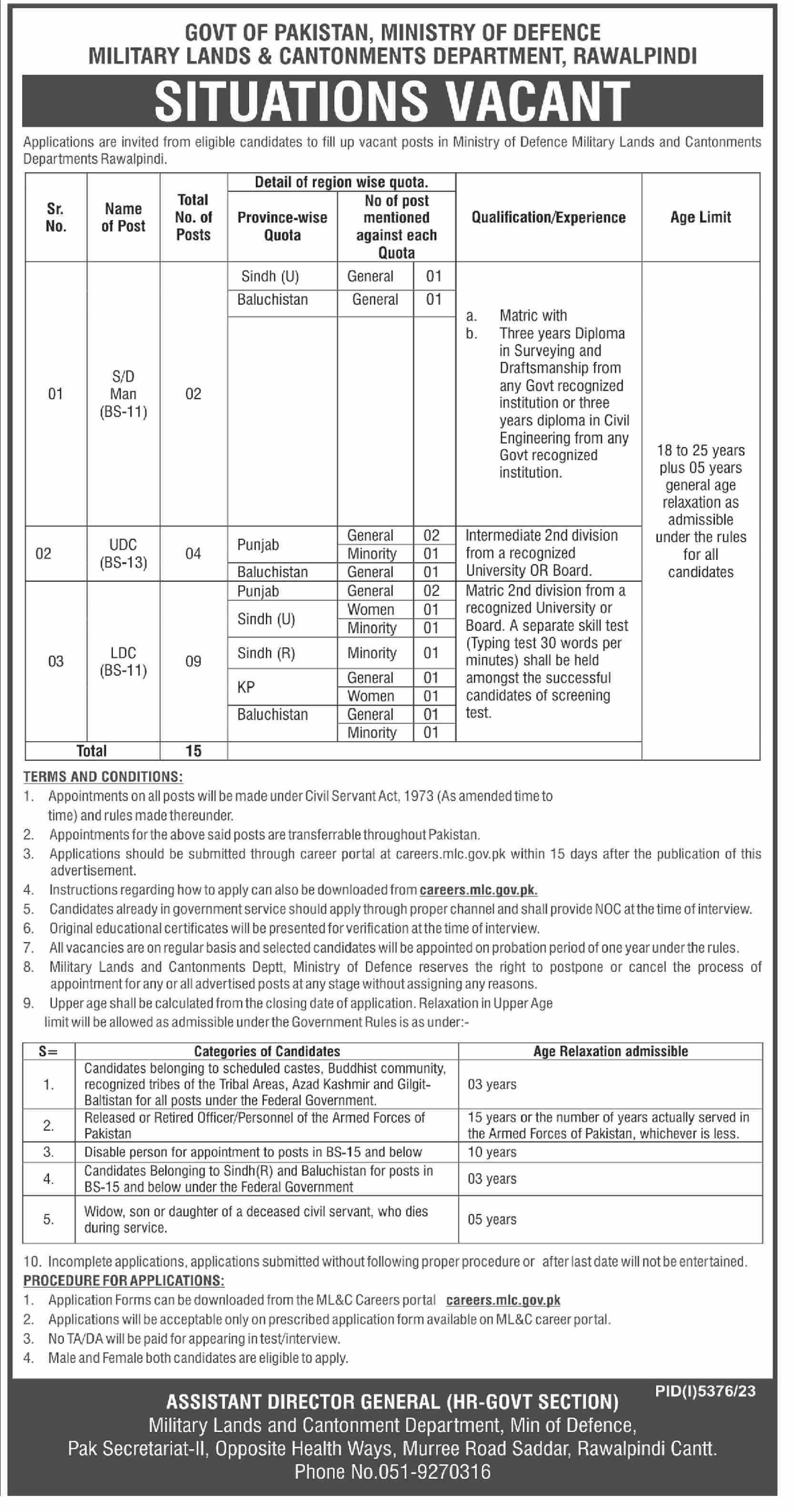 Vacant posts including sd man, ldc and udc are announced in Military Lands and Cantonment Department Rawalpindi, rawalpindi Punjab Pakistan as per 9 March 2024 advertisement in daily Dawn Newspaper. Candidates with Intermediate and Matric etc. educational background will be preferred.