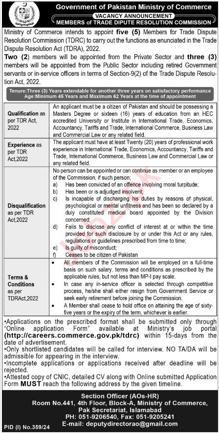 Vacancies in Ministry of Commerce Advertisement July 2024