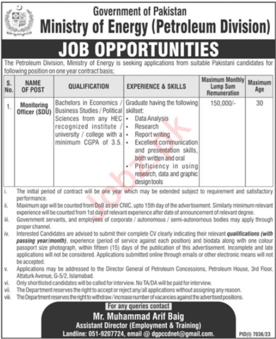 Ministry of Energy Islamabad, islamabad Islamabad Pakistan invites applications from eligible candidates for the post of monitoring officer as per advertisement of May 19, 2024 published in daily Jang Newspaper. Preferred Education is Bachelor etc.